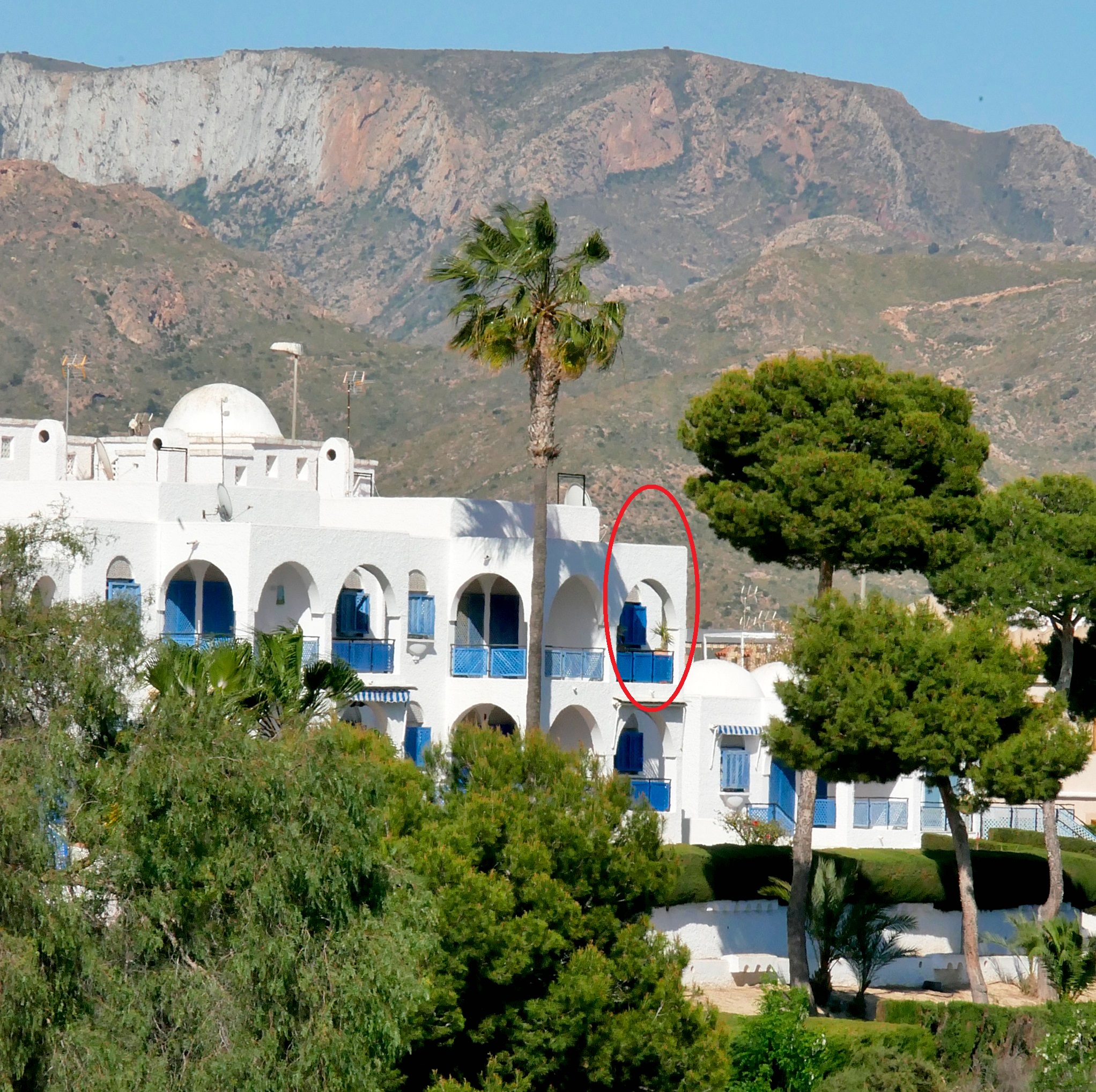 Piscina comunitaria. Puede ver indicado el balcón del apartamento